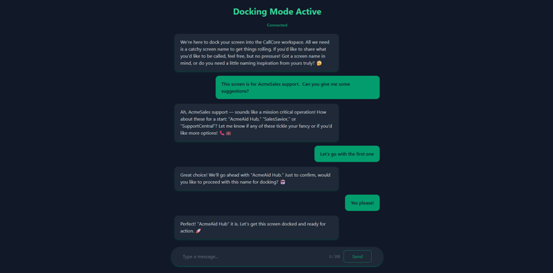 CallCore’s conversational AI assistant walks users through the docking process, suggesting names and handling setup automatically — no technical steps required.